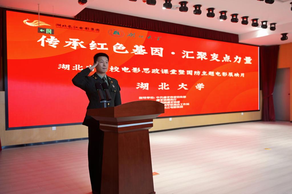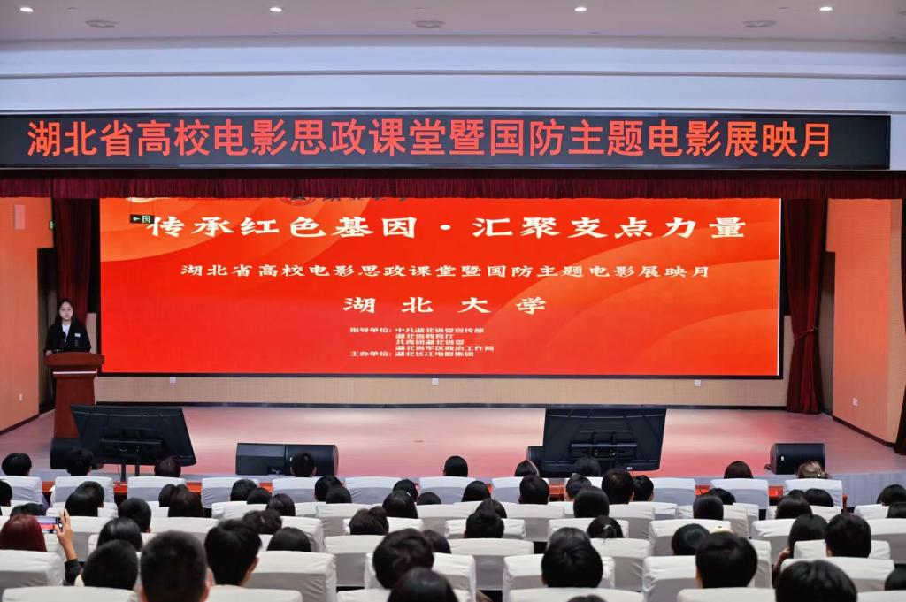 为隆重纪念中国人民抗日战争暨世界反法西斯战争胜利80周年,深入学习贯彻习近平新时代中国特色社会主义思想,进一步提升青年学生国防观念与安全意识,10月12日晚,由中共湖北省委宣传部、湖北省教育厅、共青团湖北省委、湖北省军区政治工作局联合发起,湖北长江电影集团与湖北大学校团委联合承办的“传承红色基因・汇聚支点力量——湖北省高校电影思政课堂暨国防主题电影展映月”活动在我校长江新区校区顺利举行。此次活动采用主题宣讲与现场观影相融合的形式,为三百余名青年学子呈现了一堂内容生动的思想政治教育课程。