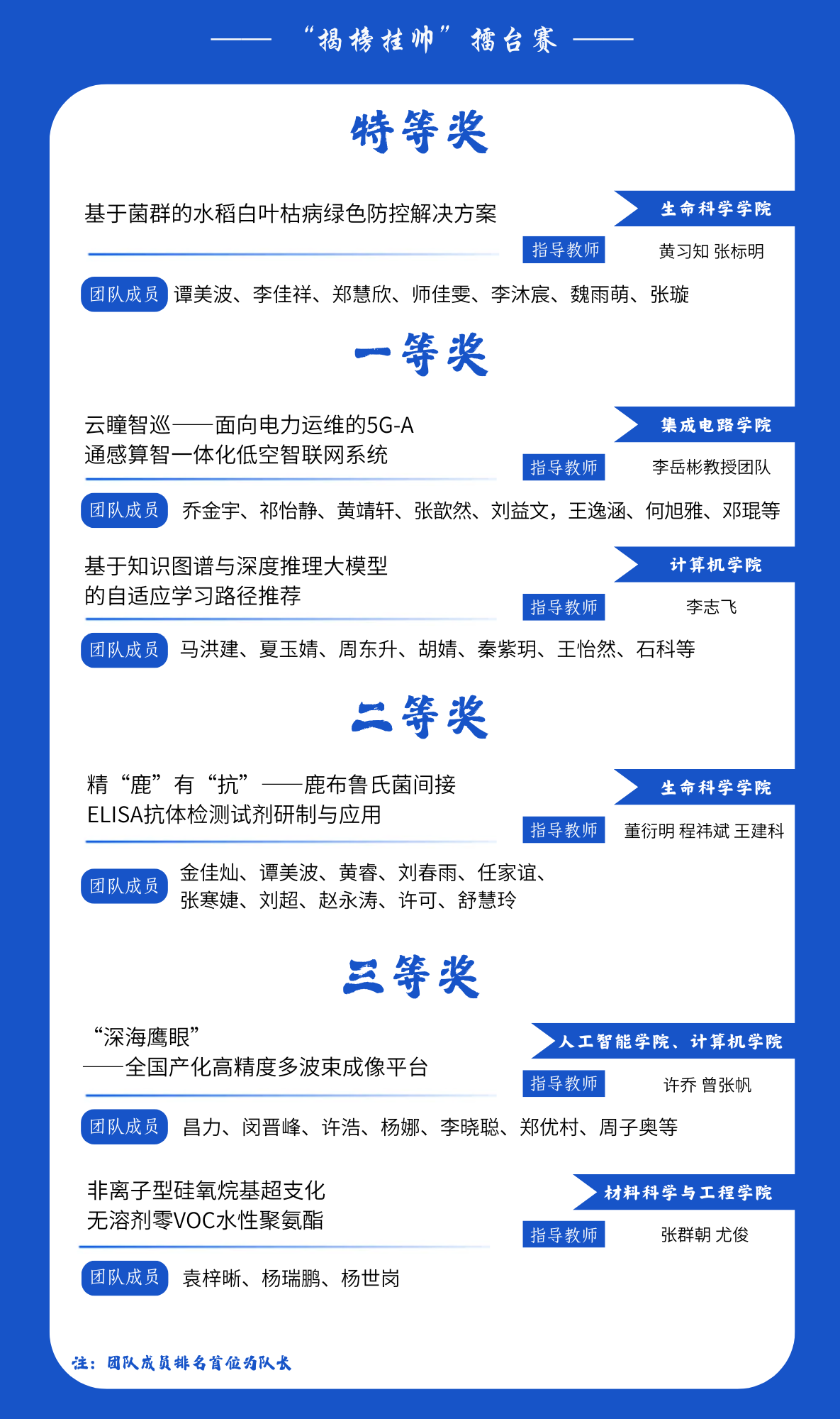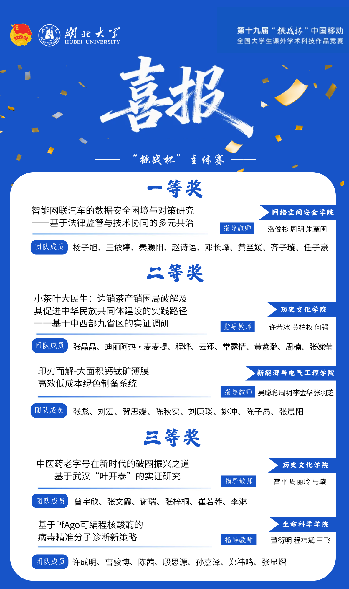11月3日,第十九届“挑战杯”全国大学生课外学术科技作品竞赛在南京大学落下帷幕,我校11项作品入围国赛决赛,共斩获主体赛一等奖1项、二等奖2项、三等奖2项,“揭榜挂帅”专项赛特等奖1项、一等奖2项、二等奖1项、三等奖2项,获奖数量和质量均创我校“挑战杯”国赛历史新高。