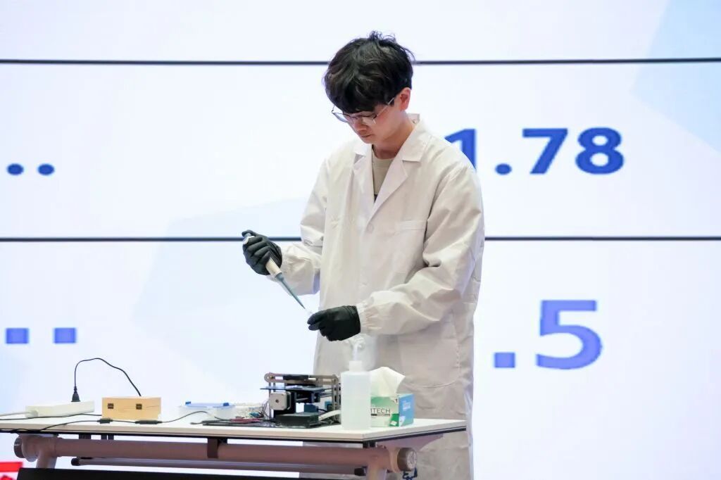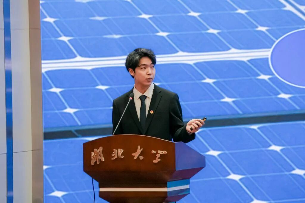新能源与电气工程学院研究生张彪则以“以钙碳矿之光,点亮零碳未来”为主题,讲解了他们团队在“挑战杯”主体赛中获国家级二等奖的“印刃而解”项目,同时团队成员姚冲同学也在现场展示了团队的科创成果“大面积钙钛矿薄膜高效低成本绿色制备系统”,充分展现了湖大学子的创新智慧与实践能力。