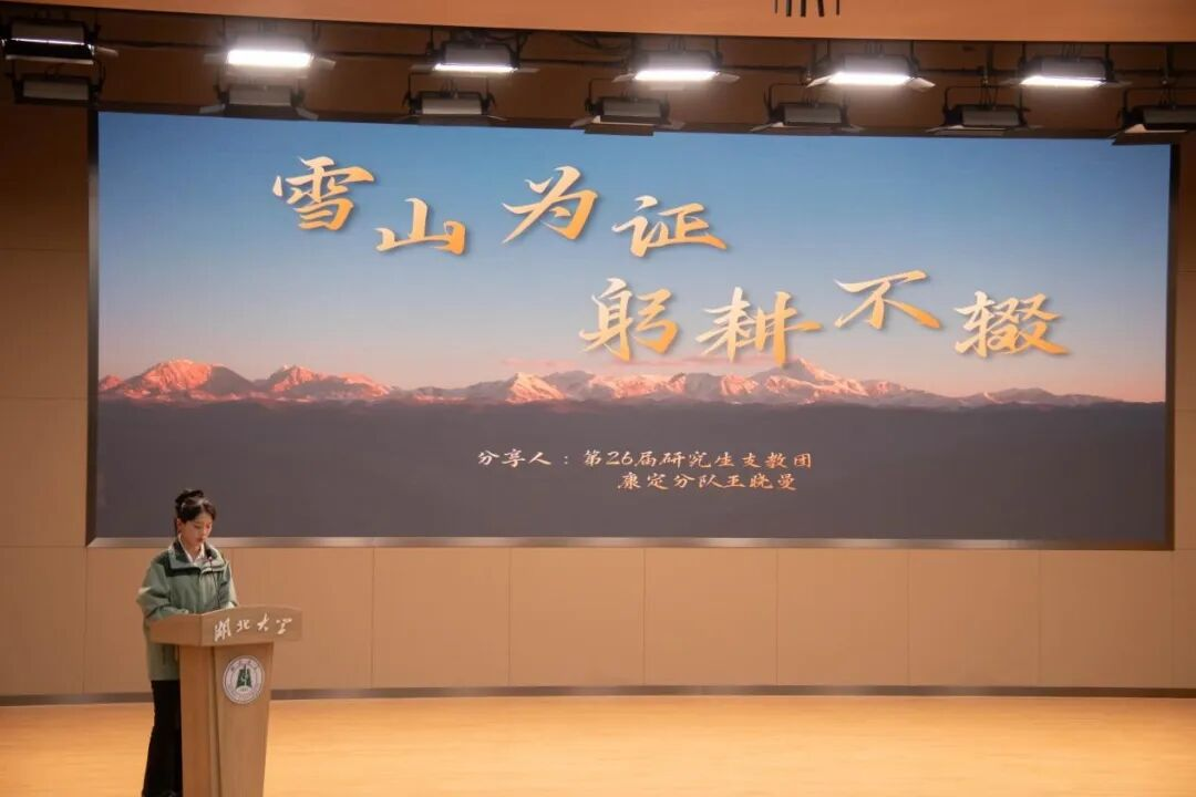 新闻传播学院2025级硕士研究生王晓曼作为第26届研究生支教团代表,以“雪山为证,躬耕不辍”为主题,分享了在康定支教期间,于风雪中见证教育韧性、于躬行中传递育人温度、于传承中共筑教育青山的动人经历,展现了湖大青年在西部大地上的实践担当与奉献情怀。