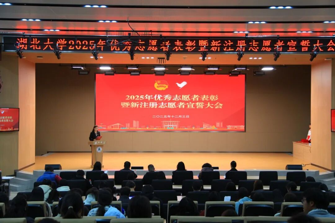 为深入贯彻习近平致中国志愿服务联合会第三届会员代表大会的贺信精神,弘扬“奉献、友爱、互助、进步”的志愿精神,12月3日下午,湖北大学2025年优秀志愿者表彰暨新注册志愿者宣誓大会于双创大楼报告厅举行。湖北省青年志愿者行动促进中心干部张小雪、学校相关部门负责人、各学院团委书记、获奖志愿者及团队代表、青年志愿者代表等共同参会,共话志愿初心,共绘服务蓝图。
