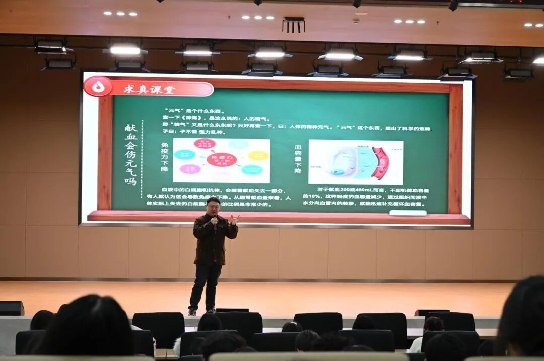 现场还举行了“热血担当 青春有我”献血主题活动,通过情景讲述、舞台短剧、视频访谈等形式,开展志愿文化宣传教育。其中,以“武汉楷模”宗晓斌26年坚持献血事迹为蓝本的演讲《一张永不褪色的献血证》,深深打动了在场师生,将现场氛围推向高潮。