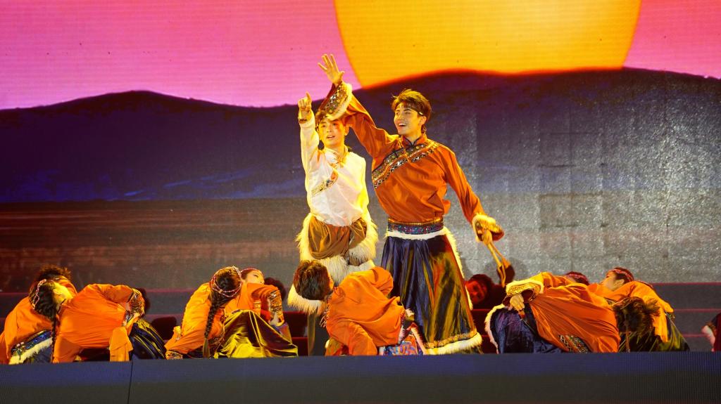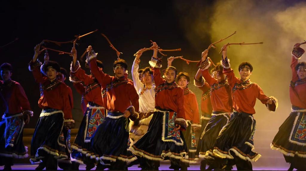 来自大学生艺术团的同学们,以刚劲有力的藏族舞姿深情演绎《唱支山歌给党听》,展现了西藏自治区成立60年来,各族人民在党中央的坚强领导下,像石榴籽一样紧紧团结在一起,共同书写下民族团结、经济发展、社会稳定壮美篇章的生动画面。
