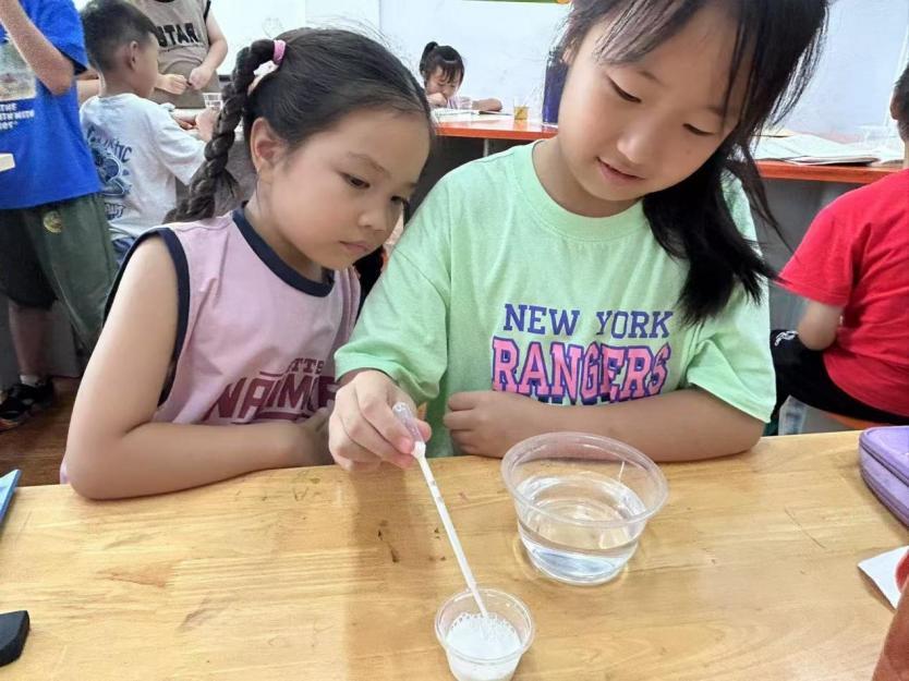 实践课上,孩子们专注的眼神、小心翼翼地边向淀粉碗里加水边搅拌,在非牛顿流体成型的那一刻发出阵阵惊叹。孩子们表示:“虽然失败很多次,但是成功的那一刻还是非常开心。”